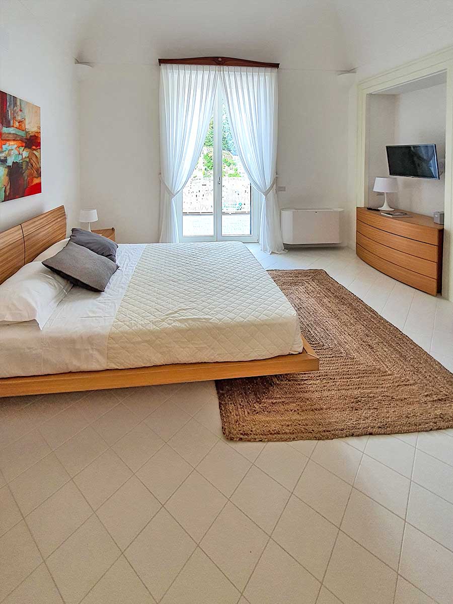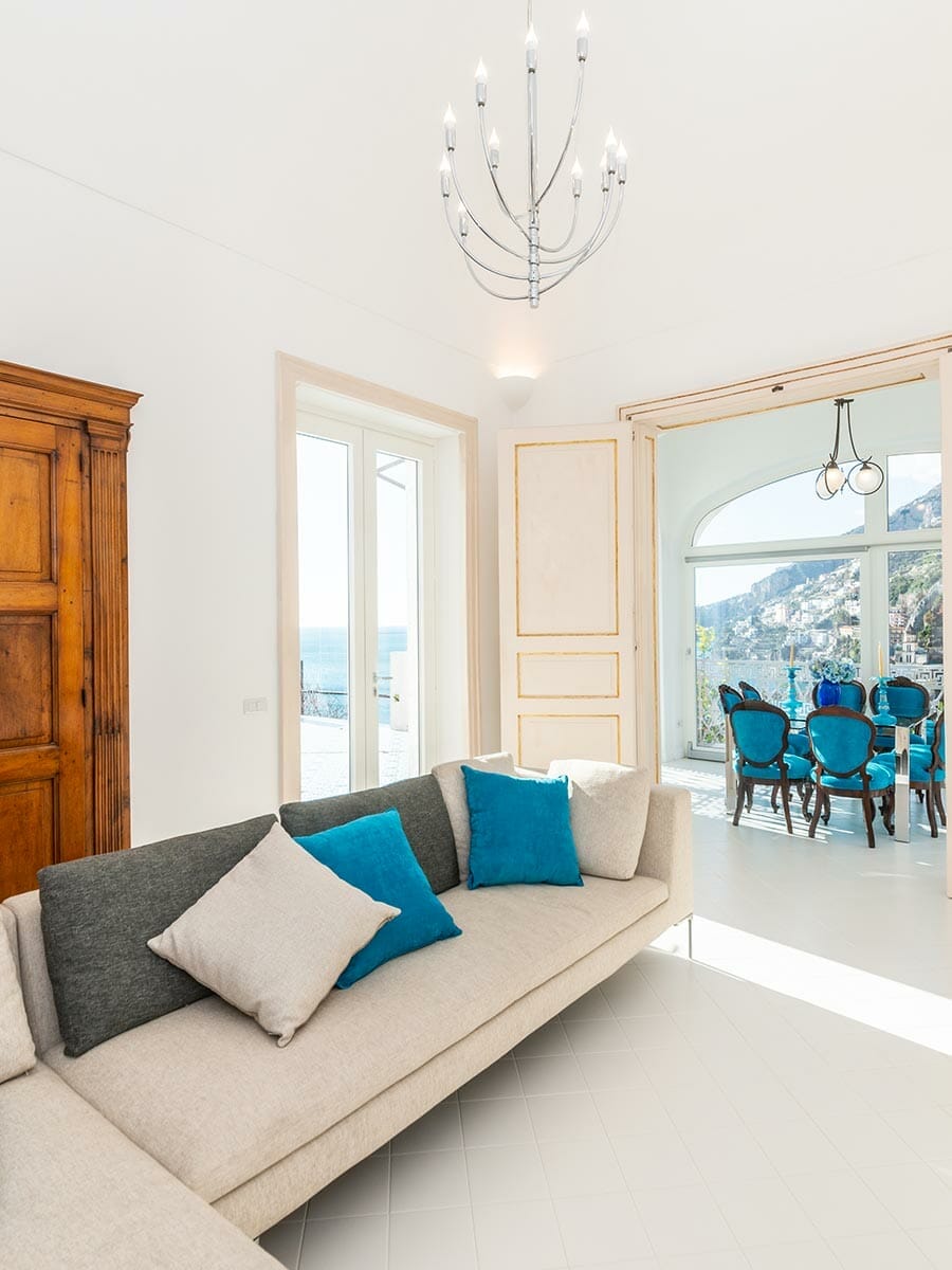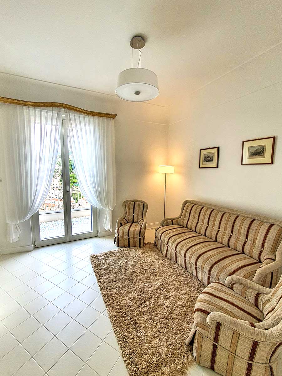 The living room is elegant and bright, in the typical style of the Amalfi coast, with a high and vaulted ceiling. It has air conditioning/heating. Furnishings include a sofa and a smart tv. From the living room you can go out on the second terrace overlooking the sea through a french door.