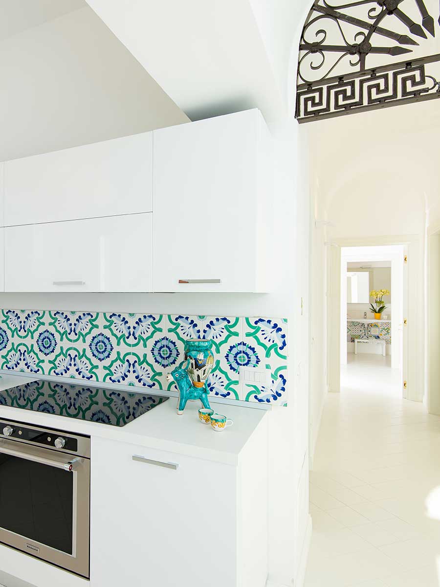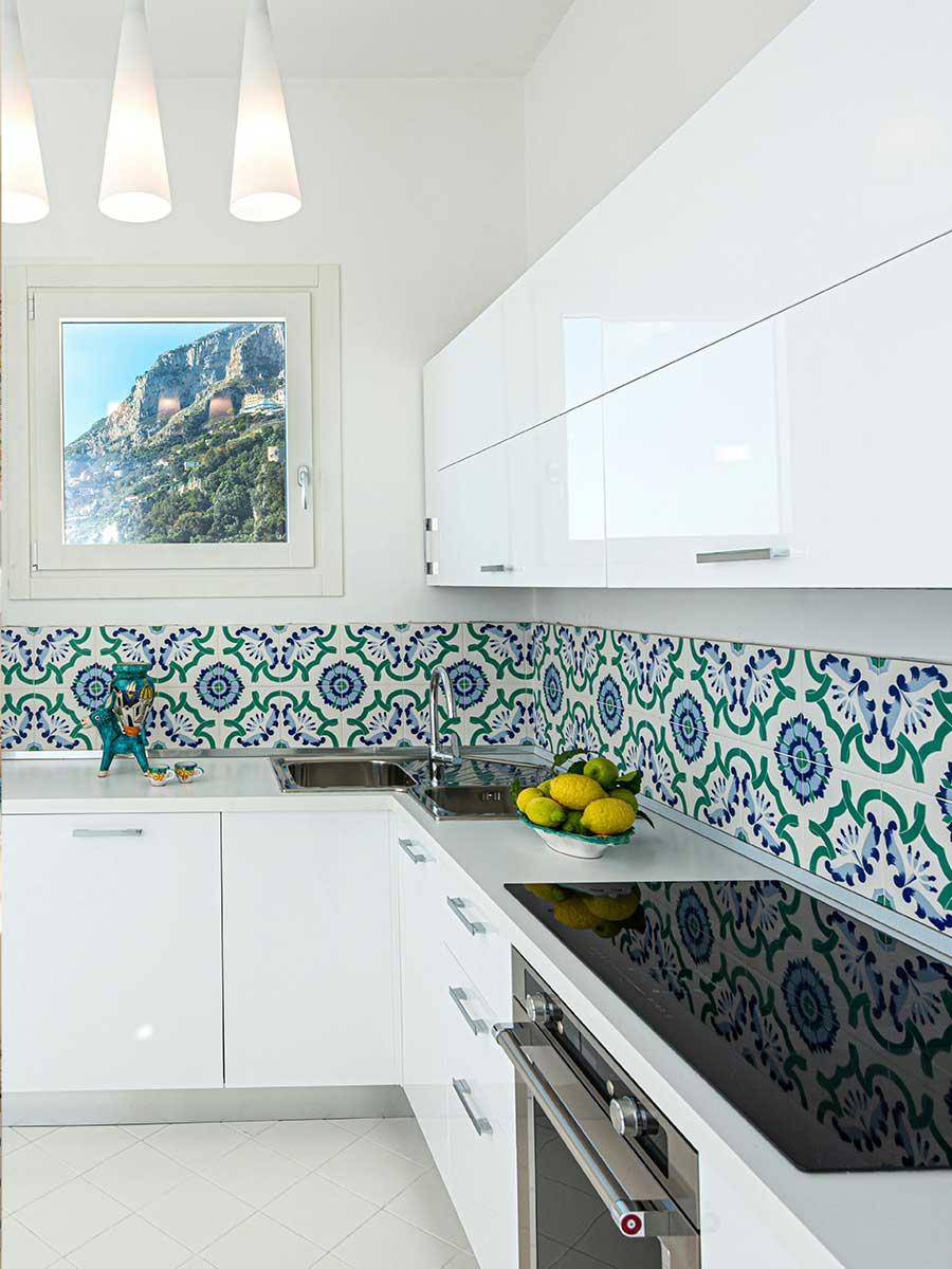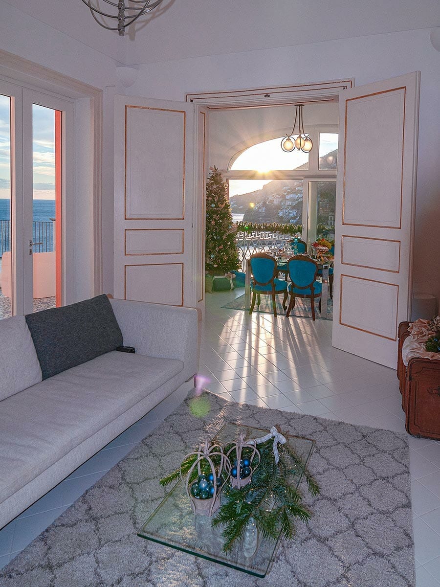 The living room is elegant and bright, in the typical style of the Amalfi coast, with a high and vaulted ceiling. It has air conditioning/heating. Furnishings include a sofa and a smart tv. From the living room you can go out on the second terrace overlooking the sea through a french door.