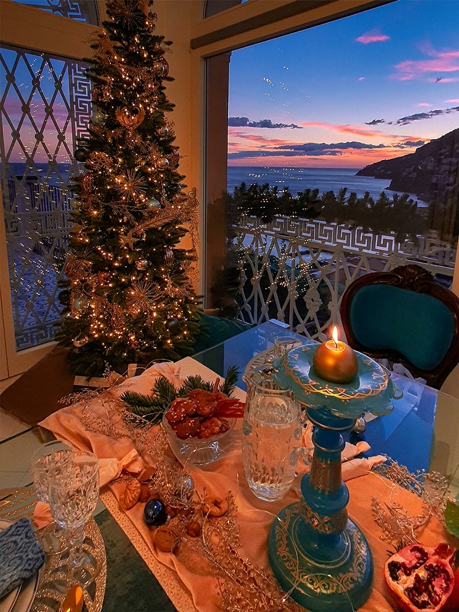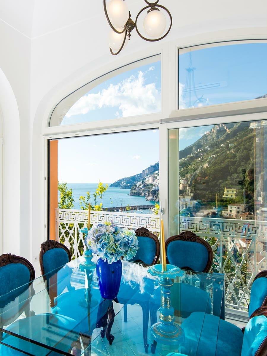 The dining room is located on a veranda, from which you can enjoy a stunning view of the coast and the sea, an enchanting atmosphere for your lunches or romantic dinners.