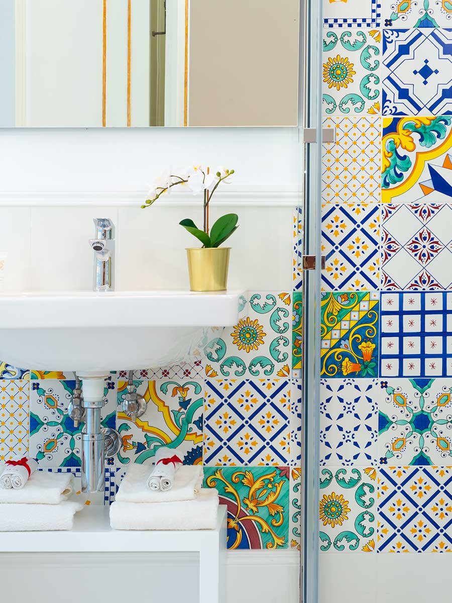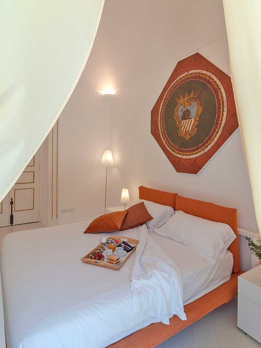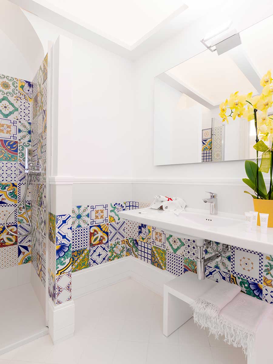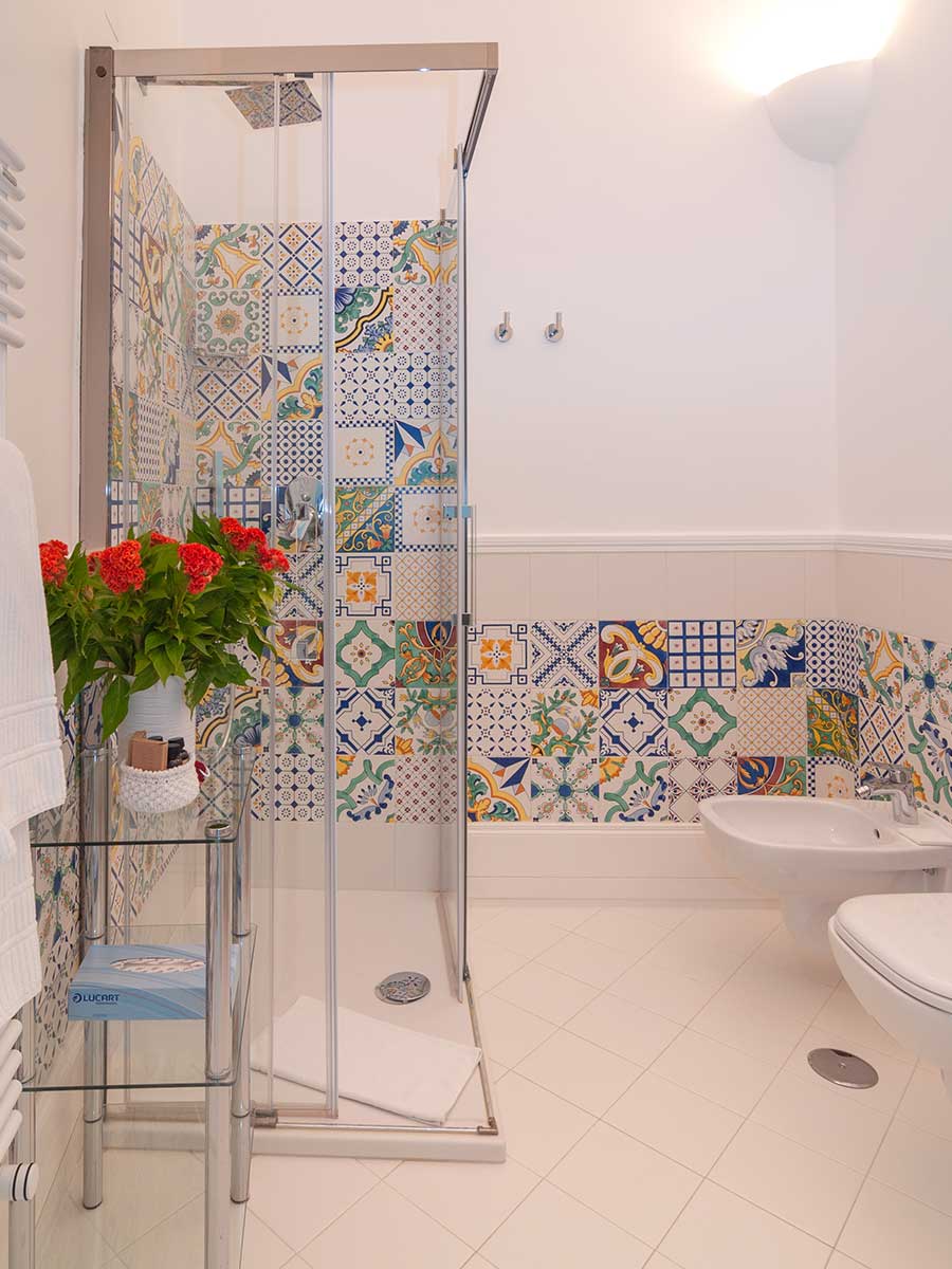 En-suite bathroom, air conditioning/heating and a double bed are part of the basic equipment. The bathroom, decorated with handmade shiny ceramic tiles, has a washbasin, a toilet, a bidet, a shower cabin and a hairdryer. Through the corridor you will get to the room and from it to the second terrace, overlooking the sea.